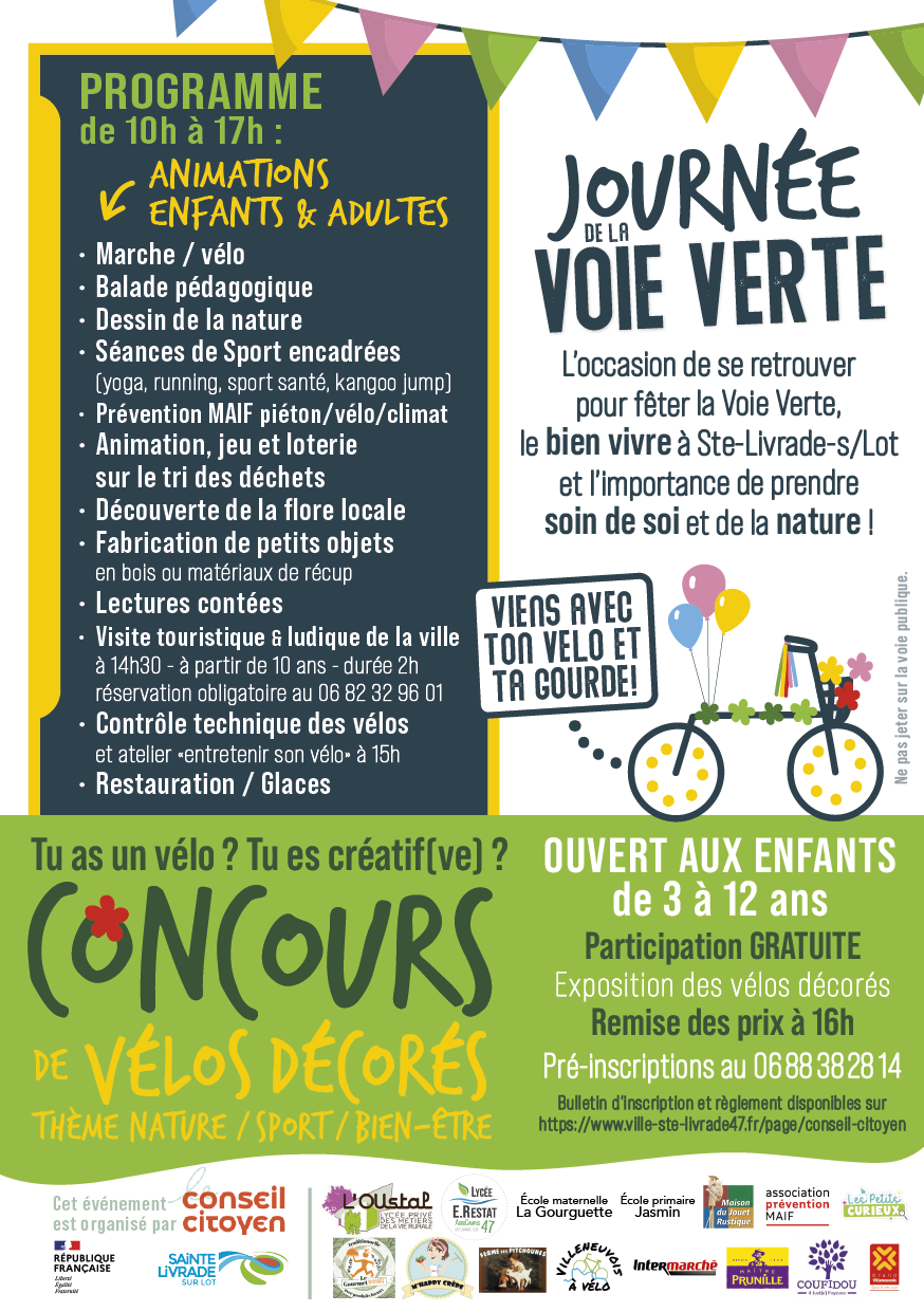 Le Conseil citoyen de Sainte-Livrade-sur-Lot organise dimanche 6 avril la première Fête de la voie verte, pour célébrer et se retrouver autour de cette belle voie verte qui relie Sainte-Livrade à Villeneuve et Le Temple-sur-Lot. Retrouvez-nous de 10 h à 16 h pour un stand d'apprentissage de la mécanique, et pour découvrir l'asso. Le programme :